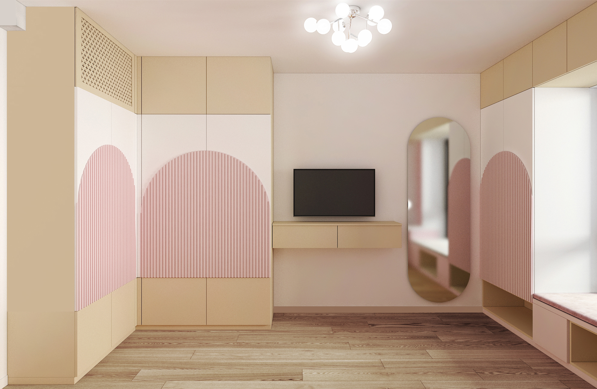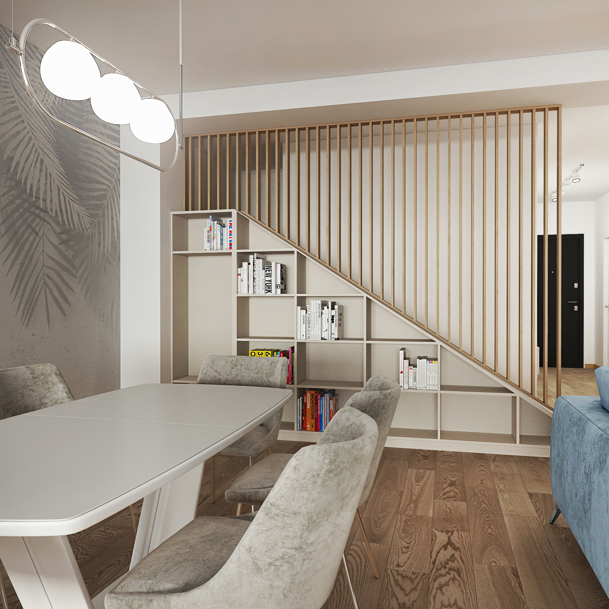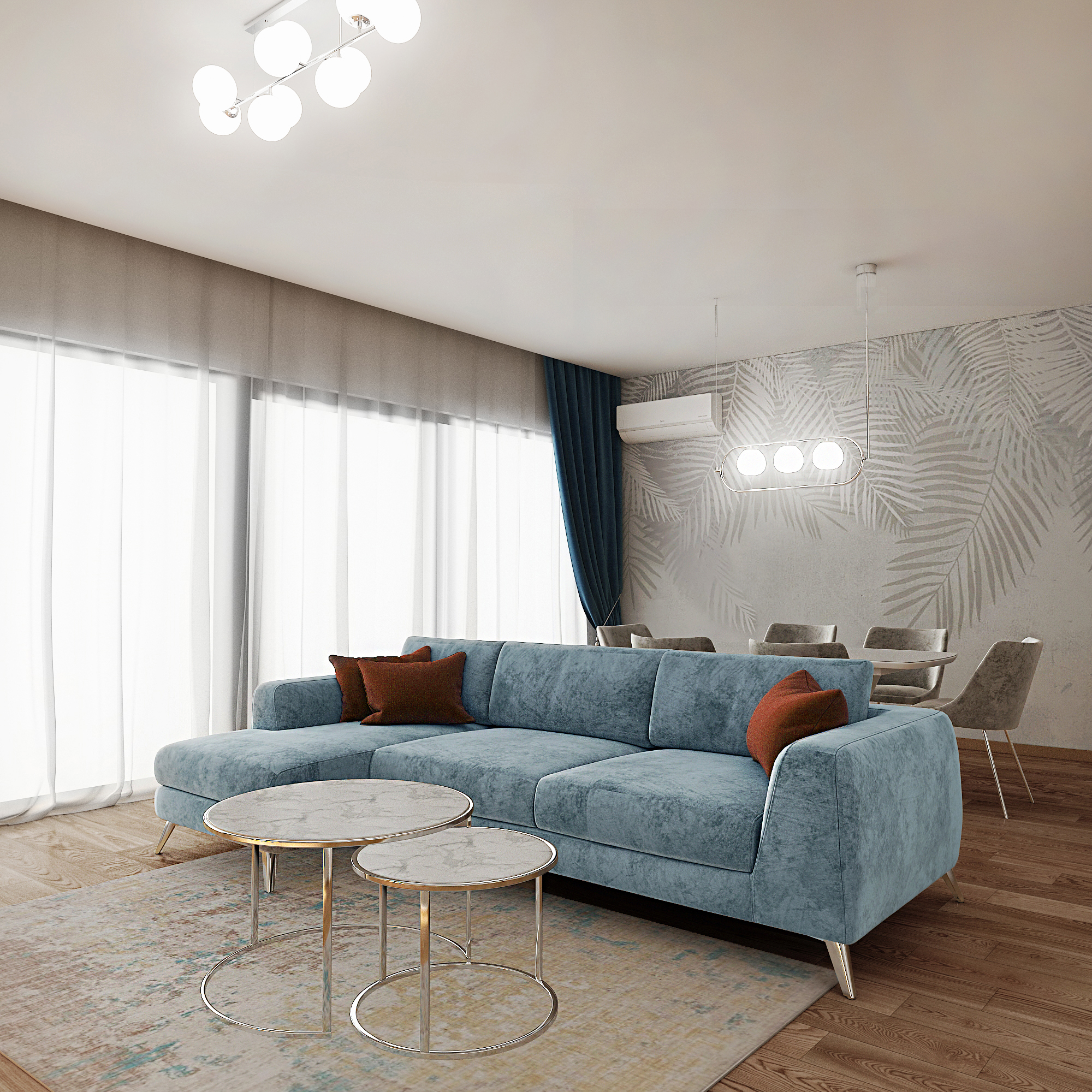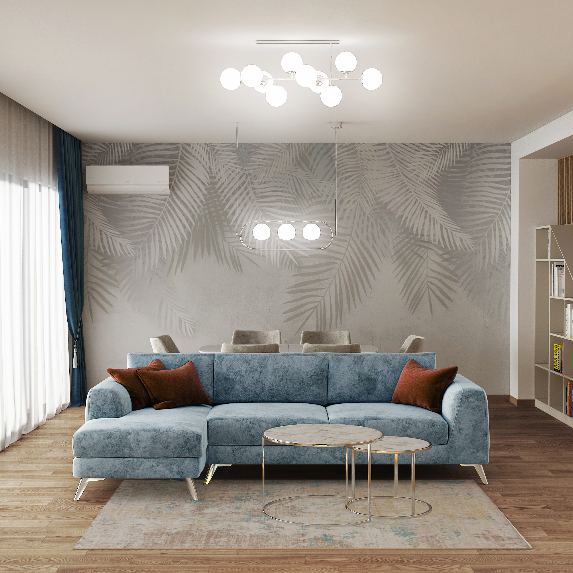 Living room in stil contemporan modern cu loc de luat masa, tematica inspirata din natura, elemente metalice aurii si canapea tapitata